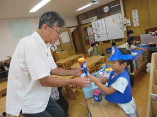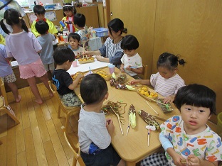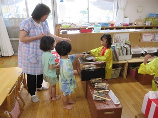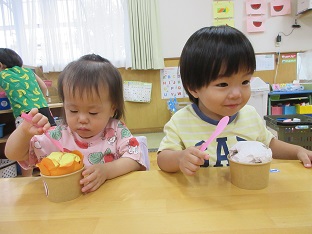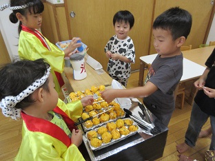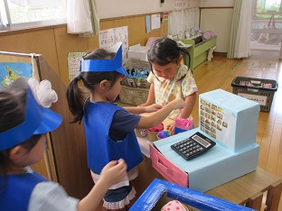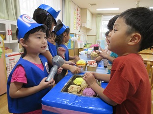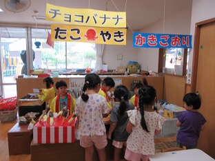 この夏、お店屋さんごっこを行いました。数日間開催し、子どもたちが何度も遊べるようにしました。数か月かけて各グループで話し合い、内容から製作、当日の担当まで子ども達が考えました。くじらグループは31アイスクリームに決まり実際のメニューを参考にし、どんな素材でアイスを作るのか話し合いました。ぺんぎんグループは夜店(焼きそば、たこ焼き、かき氷、チョコバナナ)に決まり、何の店を出すか、本物に近づけるにはどういたらいいか等、話し合いました。どちらのお店もオープンしたばかりの時はなかなかスムーズにいかないこともありましたが、回を重ねるごとに、手つきや手際もよく、子どもたちだけでお店が回るようになりました。また乳児クラスの子どもたちや職員もお客さんに来てくれたりして園内みんなで盛り上がりました。