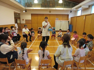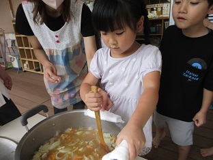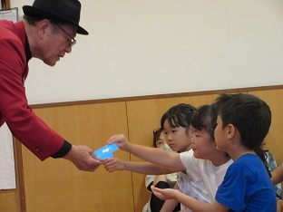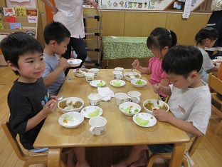 ぞうぐみパーティー 2025/06/16 6月14日(土)に年長児だけのイベント「ぞうぐみパーティー」を行いました。ぞう組だけでの行事にドキドキしていた子どもたち。前日に掘ったじゃが芋を使ってカレーを作ったり、マジックショーを見たり、ホールで職員とレクリエーションをして楽しい時間を過ごしました。最後の肝だめしでは、勇気を振り絞って「おばけの大将」に会いに行き、「勇気のしるし」をもらいました。ぞう組の子どもたちにとって記憶に残る思い出となったと思います。2025-06-14