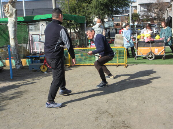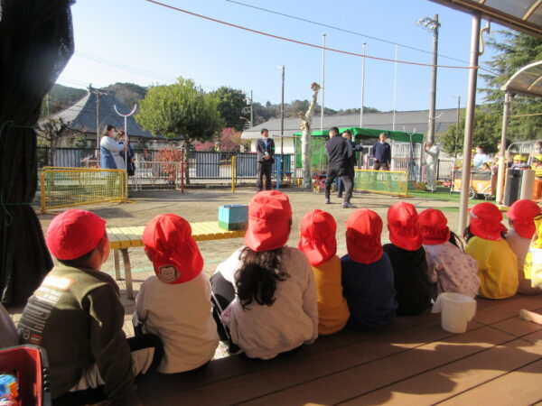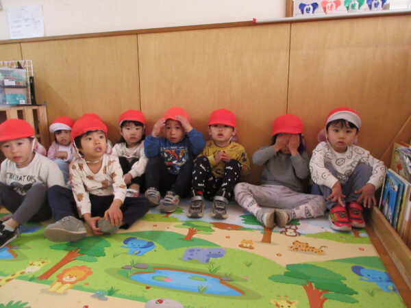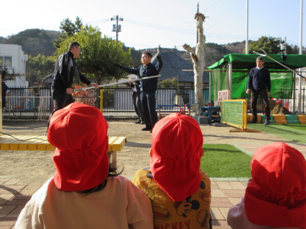 先日、青梅警察署の方に来て頂き、不審者対応訓練を行いました。不審者になり切った警察官が、園庭で遊ぶ子どもたちにフェンス越しに声を掛け、訓練の始まりです。見つけた職員の合図で「お部屋にはいるよー!」の担任の声にはじかれるように、一斉に靴を履いたまま園舎の中へ入り、カーテンを閉めて身を潜め、安全が確認できるまで静かに避難する訓練を行いました。「とても素早く安全な場所に避難できました。」と褒めてもらうことができました。そのあとは、さすまたの使い方を職員が教わるのを、応援して見学しました。2026-01-19