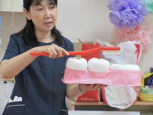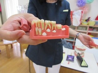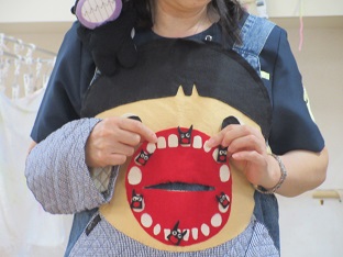 歯磨き指導 2025/06/04 6月4日は「虫歯予防デー」!!2日(月)に青梅市健康センターの歯科衛生士さんをお招きして幼児クラスの子どもたちと歯について学びました。うさぎ組はエプロンシアターとうがいの仕方について、きりん組はおやつのお話と歯磨きの仕方について、ぞう組はきりん組と同様の内容に加えて永久歯についてのお話を聞きました。その他に健康な歯で過ごすための「3つのお約束 ①寝る前の歯磨き ②おやつは時間を決める ③好き嫌いはしない 」を教えてもらいました。2025-06-02