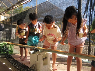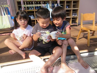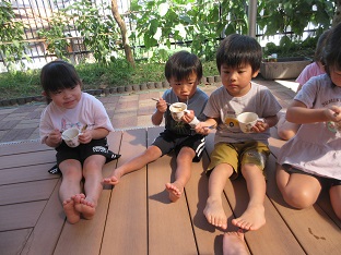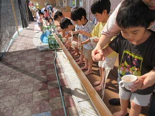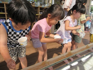 流しそうめん 2025/08/12 今年も流しそうめんの日がやってきました。おやつの時間に合わせ、簔輪さんが長い竹を割って作った流し台をテラスに用意して、流しそうめんの始まりです。子どもたちは園庭を見て「おー!」と声をあげ期待を膨らませていました。流れてくるそうめんを真剣な眼差しですくい、そうめんがすくえると嬉しそうな顔を見せてくれた子どもたち。自分ですくったそうめんを「おいしい!!」と言ってもりもり食べていました。2025-07-30